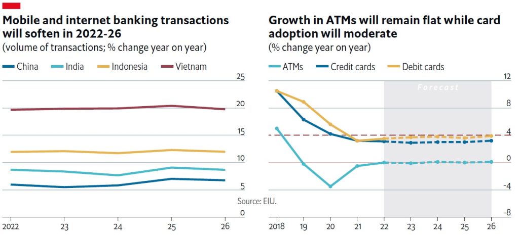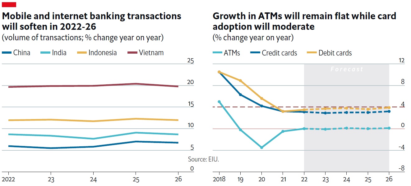 EIU forecast that growth in ATMs will remain flat during 2022-26, while that of credit and debit cards will moderate to 3% and 3.7%, respectively.