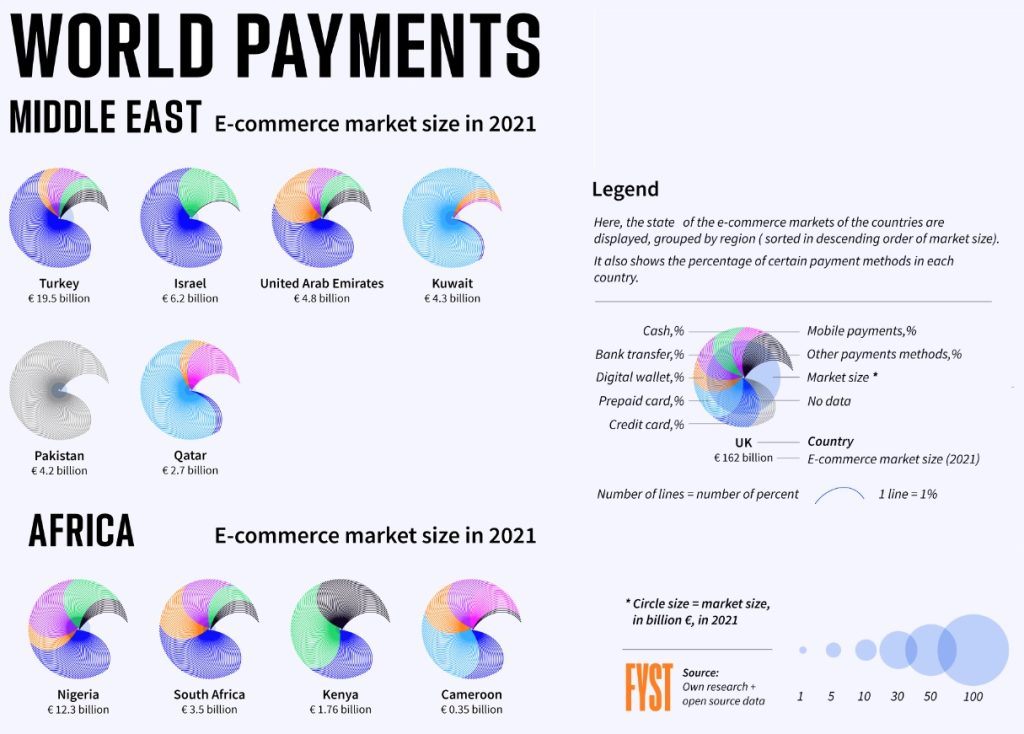 FYST gathered data across 10 countries (Turkey, Israel, Qatar, Kuwait, United Arab Emirates, Pakistan, South Africa, Nigeria, Cameroon, and Kenya) and shines a light on the proportion of cards, bank transfers, digital wallets and other methods used for online purchases in each country.