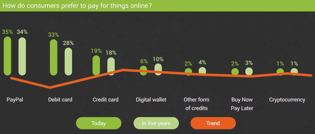 By comparison, the top three most popular payment methods today (PayPal, debit cards and credit cards), are all set to decrease in popularity with debit cards dropping the most, from 33% today, to 28% in five years’ time.