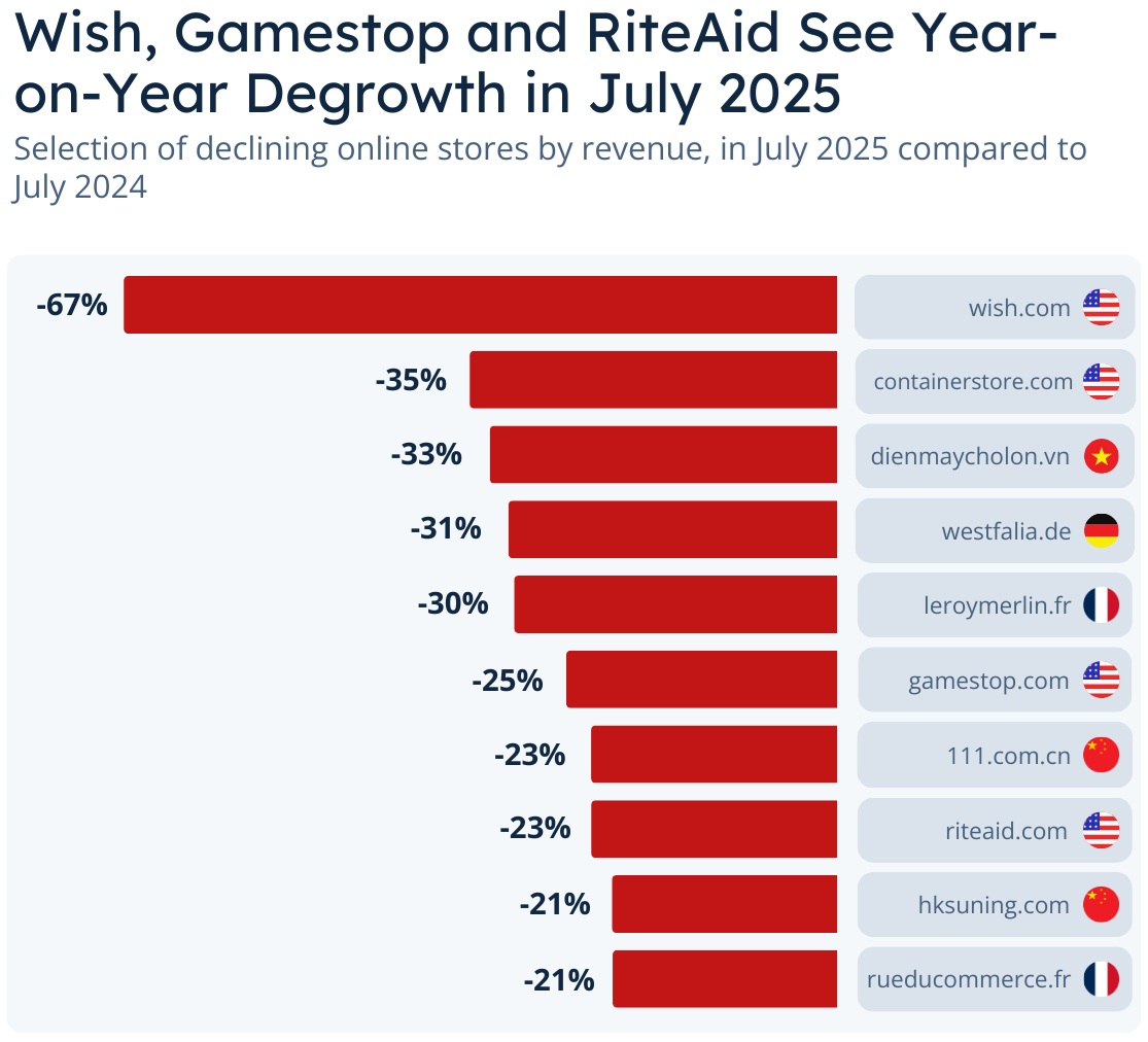 Wish.com, once a poster child for discount e-commerce, recorded a dramatic 67% year-on-year sales decline.