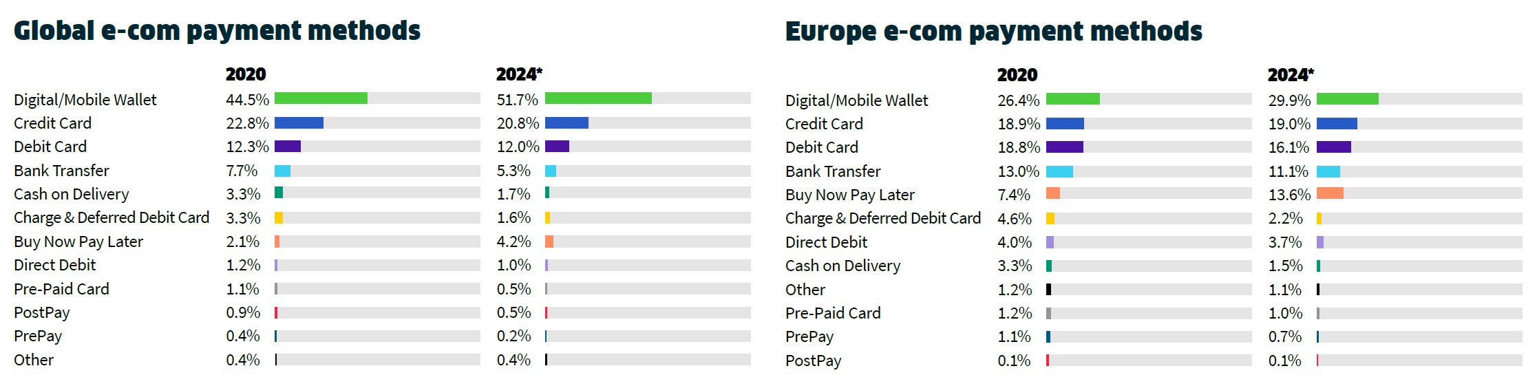This dominance is expected to continue to grow with e-wallets anticipated to account for up to 30% of e-commerce transactions in Europe by 2024.