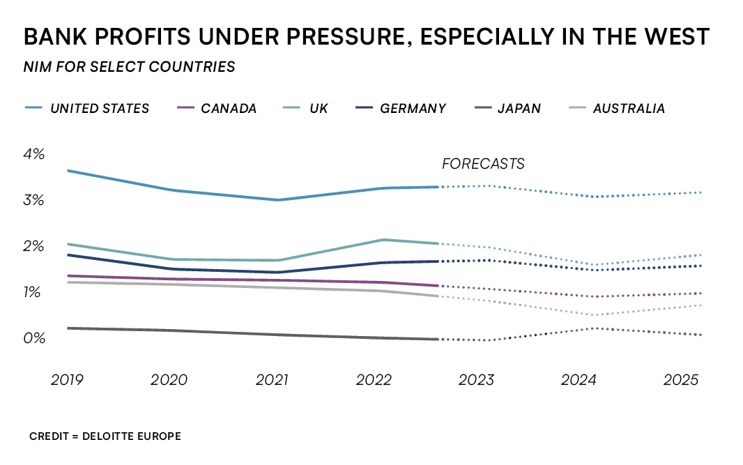 Deloitte say bank net interest margins in major economies – the money banks make from lending money after costs – is set to decline.