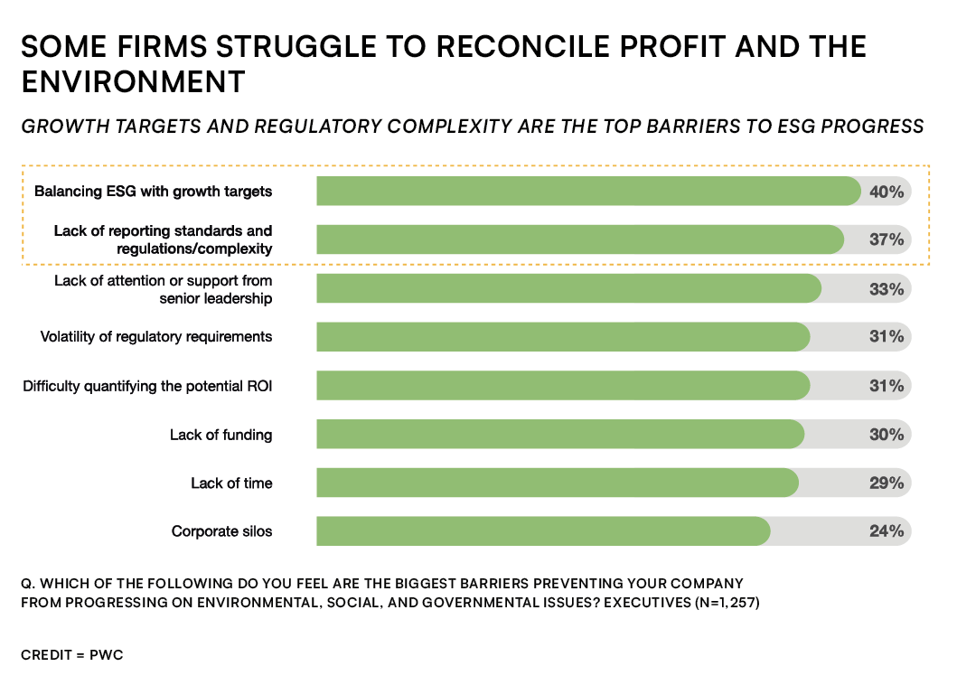 As the graph above shows, regulation in its various forms – both as a shifting target, and as an ever-increasing burden – is as much of a barrier to sustainability success for companies as the perceived cost of focusing on sustainability.