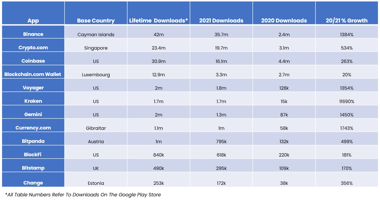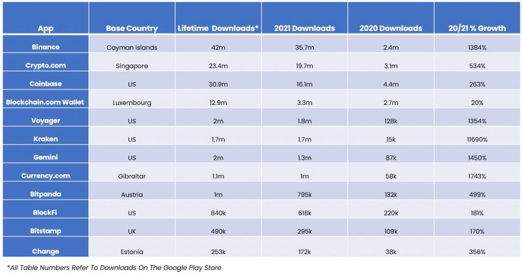 In Europe, the market growth was led by Austrian unicorn BitPanda. It gained almost 800,000 (nearly 500% increase on 2020), Estonian platform Change saw almost 175,000 downloads (365% growth) and London-based Blockchain.com gained 570,000 (20% growth).