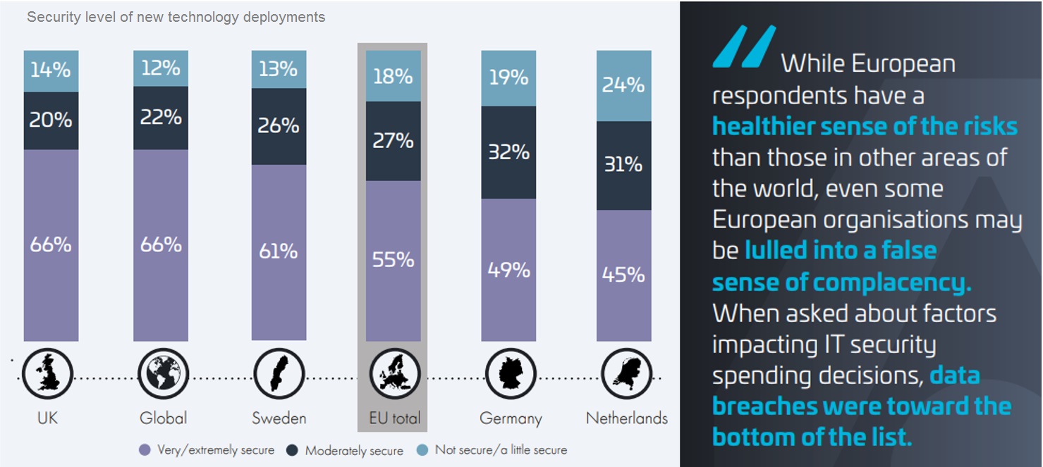 Not only must security professionals deal with a very dynamic threat environment, in which 61% of European respondents say they have been breached at some point in their company’s life, but they must also function in an increasingly restrictive regulatory environment.