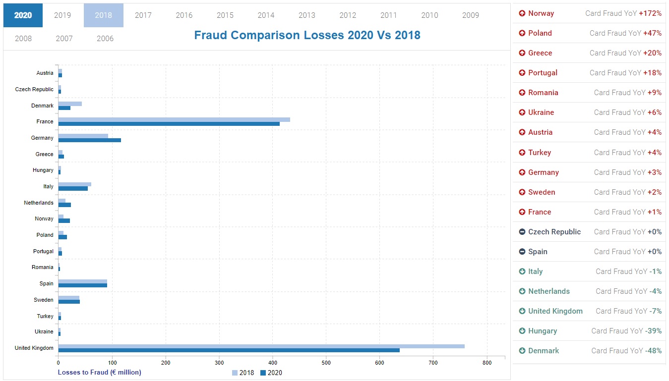 Unfortunately, fraud losses continued their increases in France (€6 million higher than 2019), Poland (€4 million higher) and Germany (€3 million higher). There was also a major attack in Norway, which led to an increase in fraud losses from around €8 million in 2019 to around €22 million in 2020, a rise of 172%, the largest rise of all the countries studied.