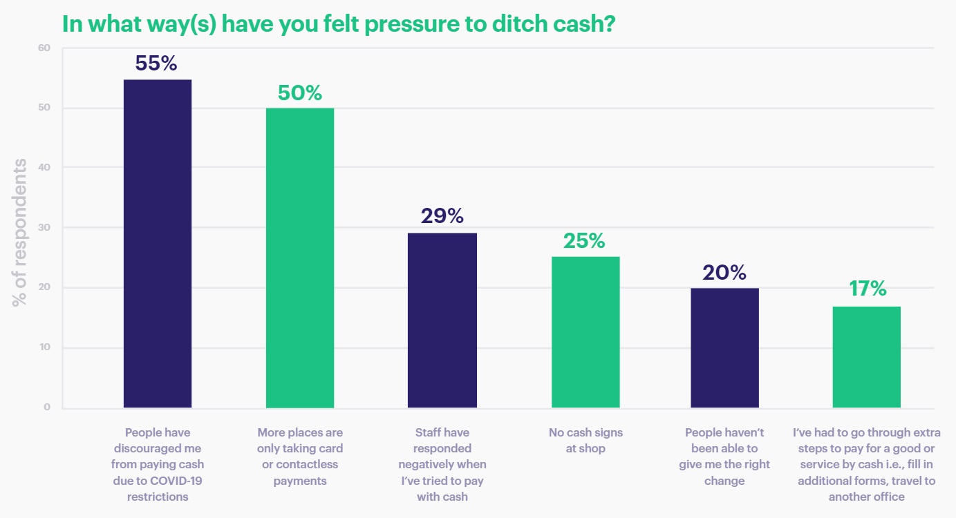 75% of people surveyed aged 65+ said they have felt pressure to ditch cash due to places only taking card/contactless payments, while 83% of consumers surveyed said the decline of cash will exclude those most at-risk in society.