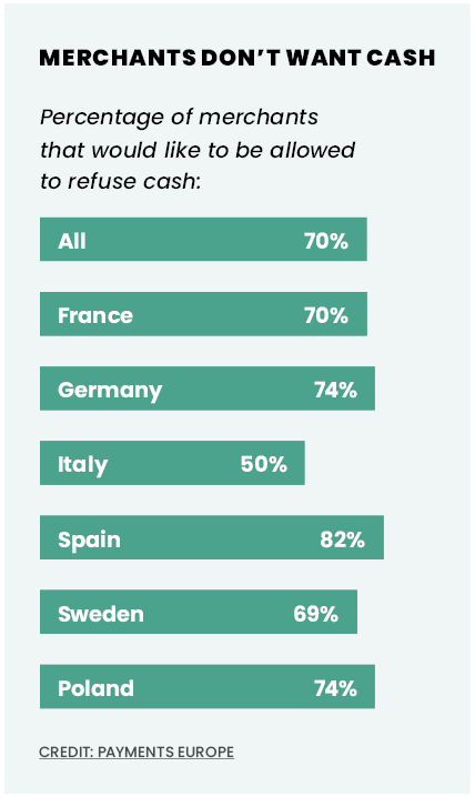 Payments Europe say that 70% of merchants don’t want to use cash owing to the handling costs and hygiene concerns of consumers.