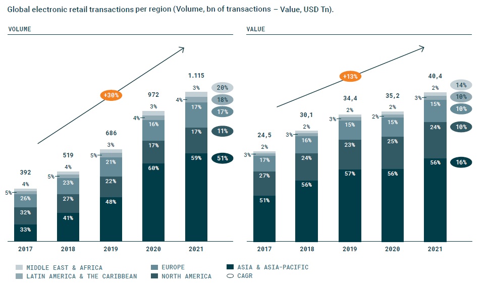 Overall, electronic payments adoption has been growing globally, across an increasingly varied mix of payment rails and interfaces and transaction channels, to reach a volume of over 1.1 trillion transactions by 2021 at an annual compounded growth rate (CAGR) of 30% between 2017 and 2021 – according to the findings of a new report by Arkwright.