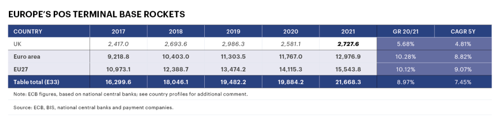 Reflecting the increased use of cards across the thirty-three countries examined by Payments Cards and Mobile, the number of point of sale (POS) devices across Europe grew by 8.97 percent, higher than the five-year average of 7.45 percent.