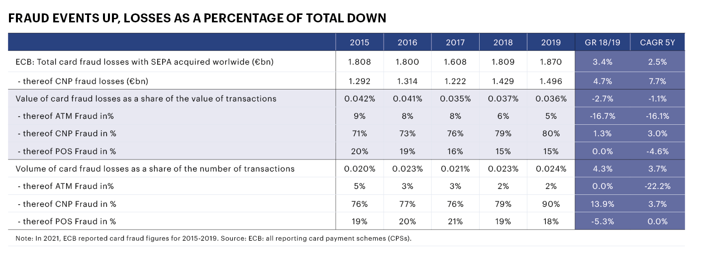 The prevalence of “card not present” (CNP) fraud among fraud types shows the intransigence of online fraud as a problem.
