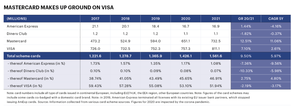 “While Visa leads in Europe, Mastercard is making up ground.”