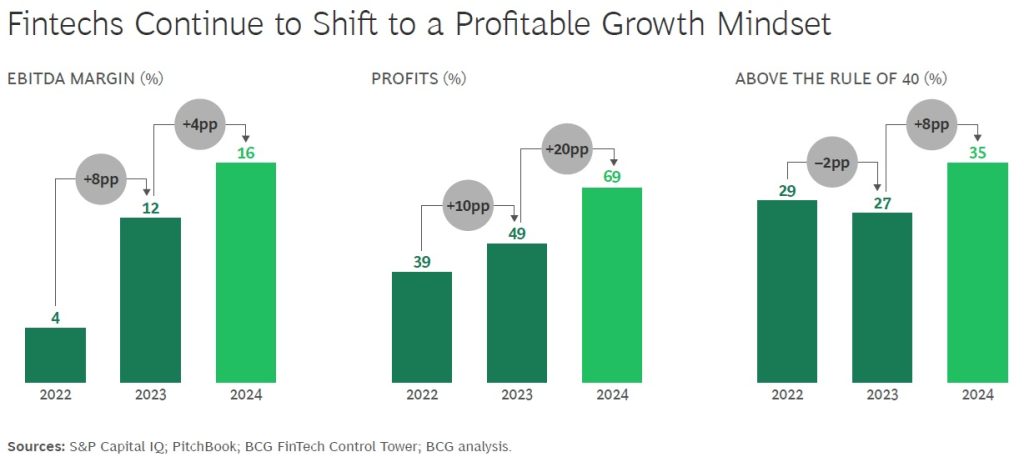 Crucially, nearly 70% of public fintechs turned profitable in 2024 – up from less than half in 2023 – while average EBITDA margins climbed to 16%.