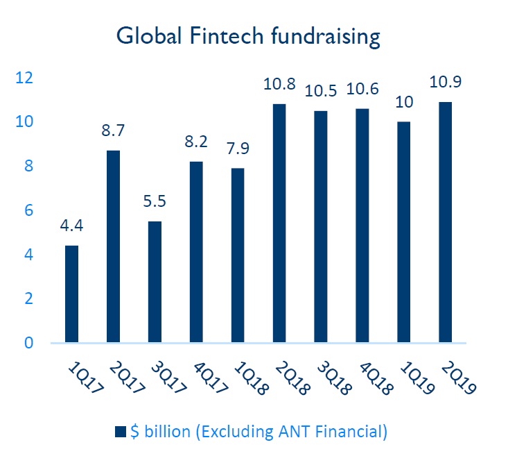 Fundraising in FinTech continues its record-breaking course. With 818 fundraises so far in 2019, the anticipated annualised figure of 1,636 would set a new annual record, narrowly beating those figures recorded in 2017 (1,632) and in 2016 (1,633). Furthermore, excluding the Ant Financial deal of June 2018, Q2 2019 recorded the most FinTech fundraising ever with $10.9 billion raised.