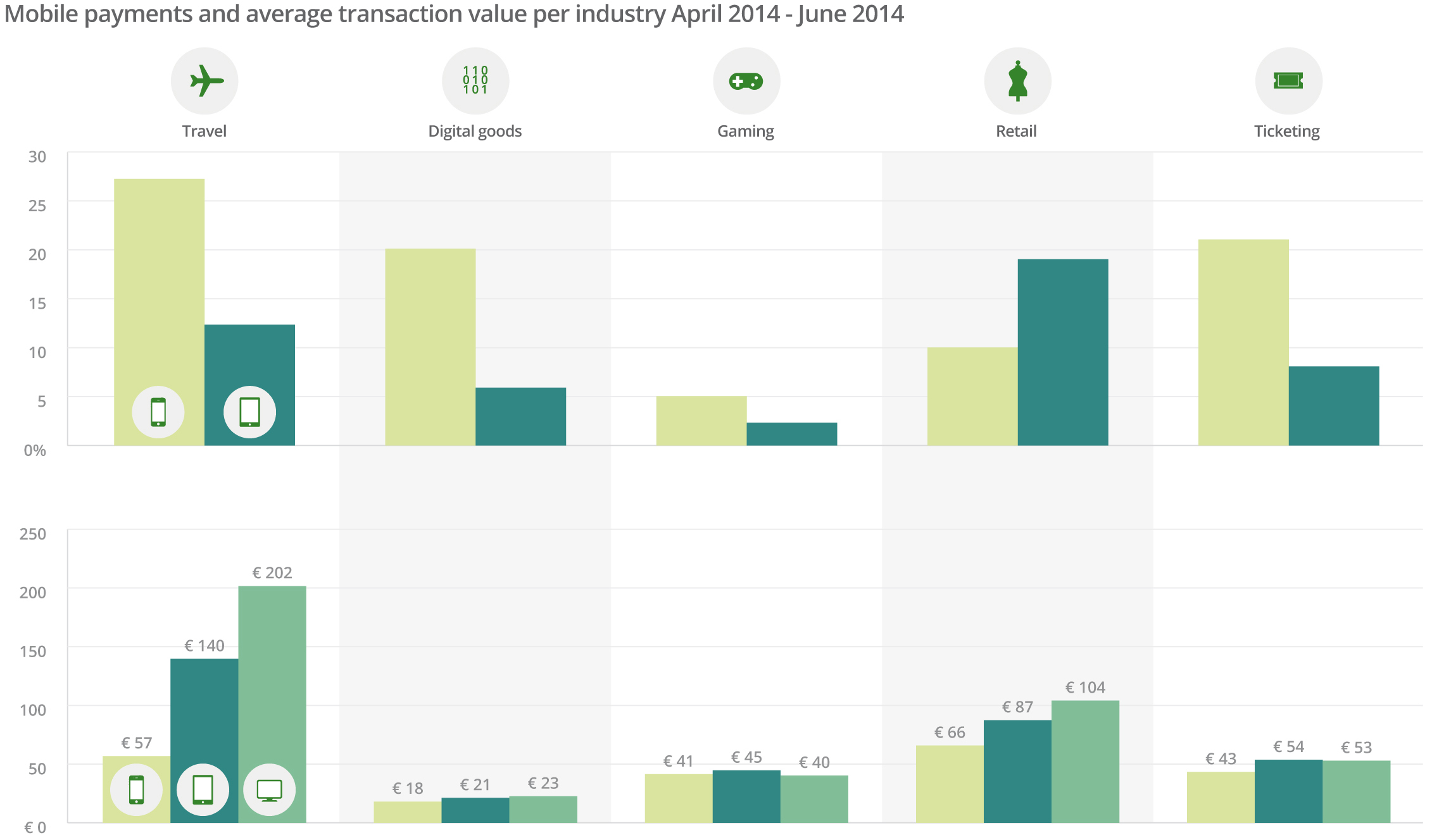 The Retail sector uniquely experienced growth in transaction value from both smartphone and tablet users in Q2, up by more than 18.2% and 6.8% respectively. Gaming showed an increase of more than 5.25% in average purchase size from smartphone users, and Ticketing saw an 11.5% increase from tablet users.