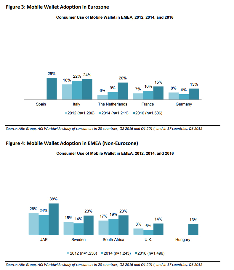 In most cases, mobile wallet adoption in EMEA is generally not showing dramatic increases, and for the most part, adoption is less than 25%.