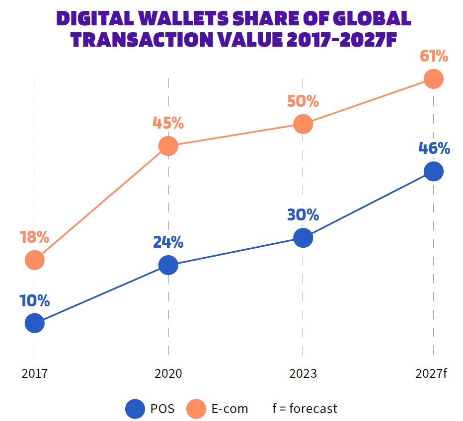 By 2027, digital wallets are projected to account for more than $25 trillion in global transaction value, or 49% of all sales online and at POS combined.