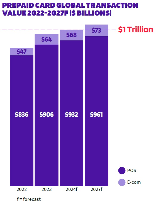 The Global Payments Report 2024 from Worldpay shows that transaction value on prepaid cards is set to surpass $1 trillion in 2024.
