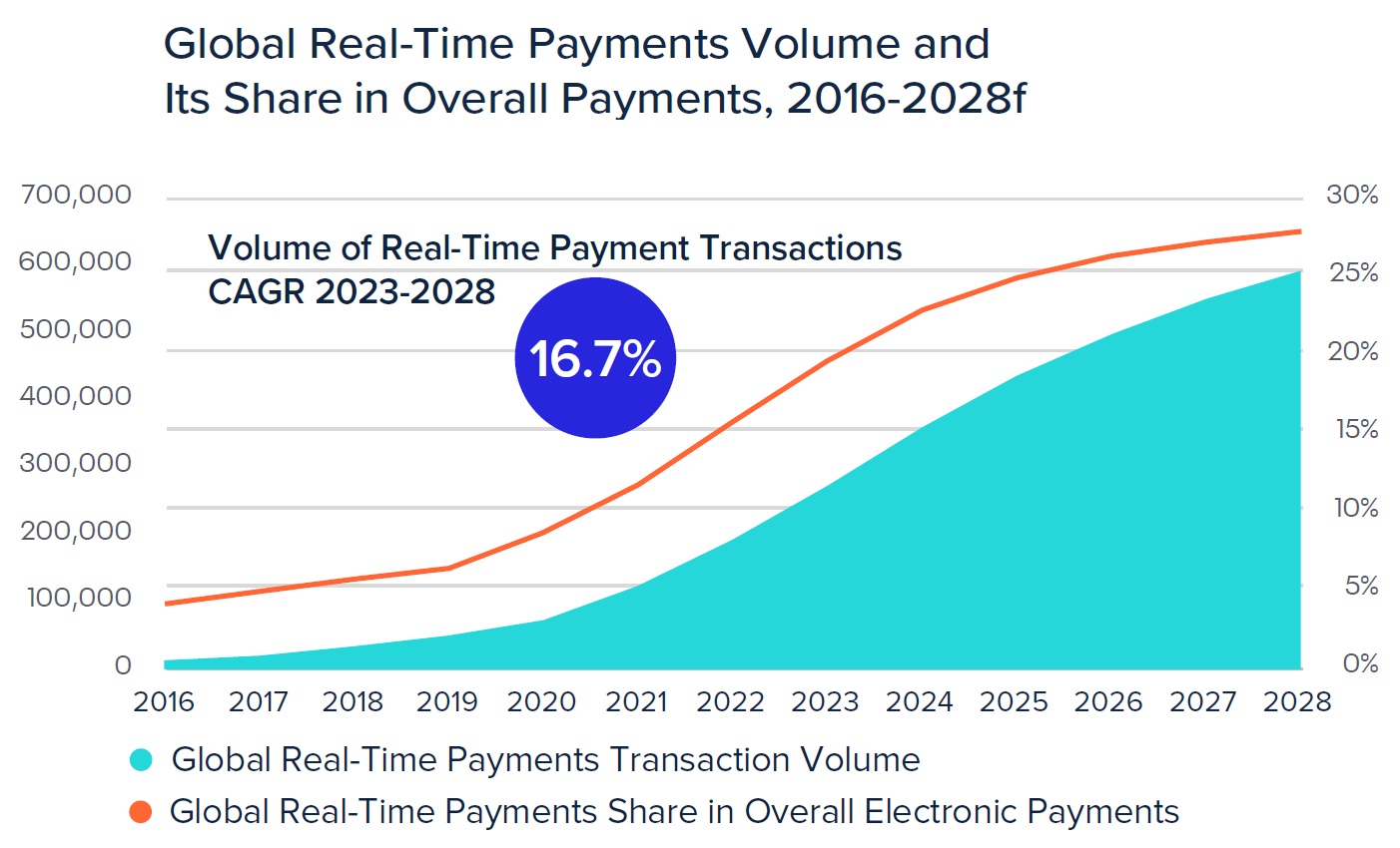 Globally, 575.1 billion real-time transactions are forecast by 2028, representing a 2023-2028 compound annual growth rate (CAGR) of 16.7%. By 2028, RTPs are expected to account for 27.1% of all electronic payments globally.