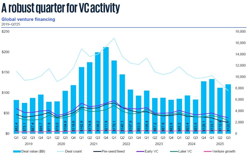 Global VC investment surged to $120 billion in Q3 2025, marking the fourth consecutive quarter of robust funding activity and signalling a sustained revival in investor confidence.
