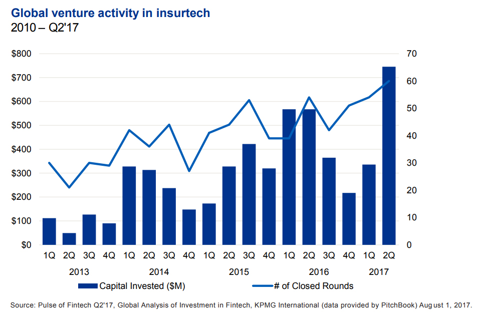 After 2 moderate quarters, VC investment into InsurTech startups was strong in Q2’17, with $745.4 million invested across 60 deals. Despite quarterly fluctuation in deal size and volume, the overall picture is one of increasing interest and investment in InsurTech innovations.