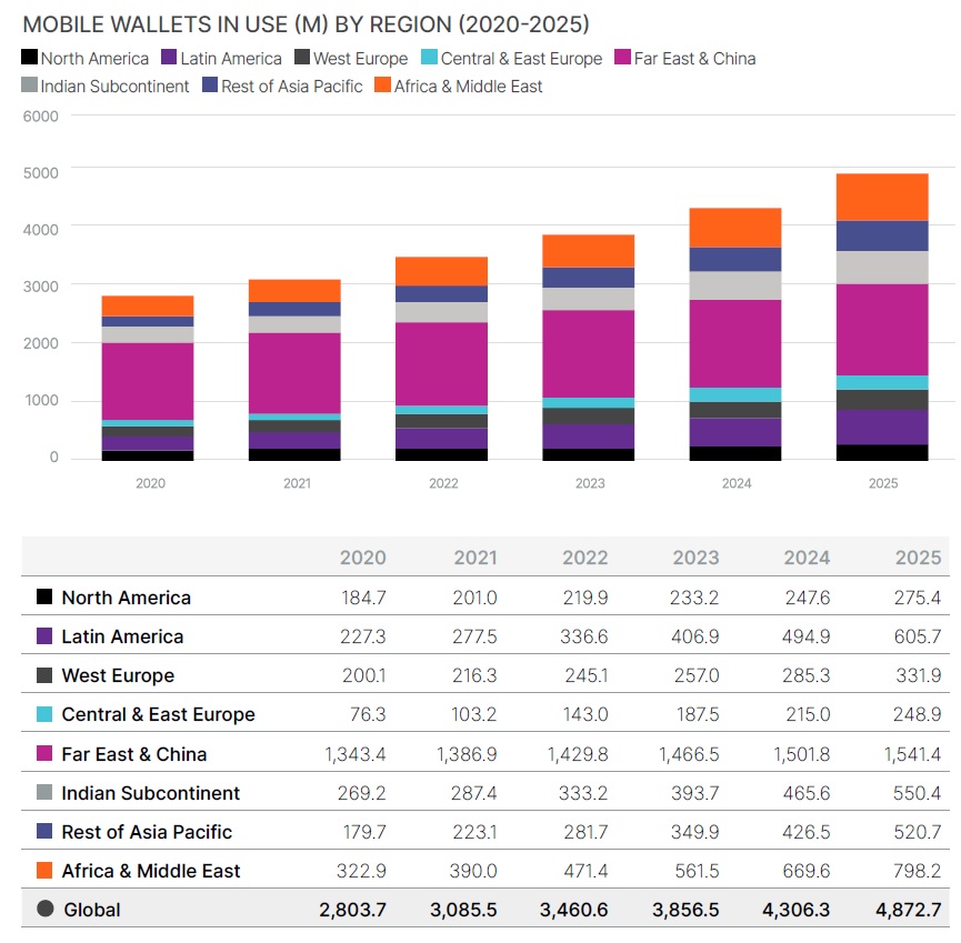 • Africa & Middle East is the second biggest mobile wallet market – The second biggest mobile wallet market is set to grow by 147% between 2020 – 2025. This is driven by expanded usage of mobile money services such as M-Pesa which are increasingly offering additional services such as access to e-commerce.