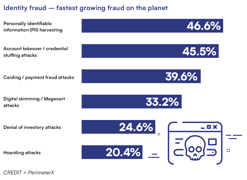 According to fraud specialists PerimeterX, attacks against user identity – whether through harvested credentials or cloned/fake user IDs – almost doubled worldwide last year, and are the fastest-growing form of fraud out there.