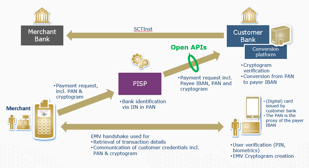 Behind the scenes, under the proposed system, the terminal would connect on-line to a dedicated platform operated by a service provider – which could also serve the role of a PISP as described in PSD2. The PISP would then identifies the bank that issued the card and send, through Open APIs, a payment initiation request. This would be processed by the bank, and a confirmation sent to the PISP and then the customer.