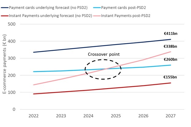 E-commerce card usage will stagnate at current levels of around €260bn annually and by 2025, boosted by increased consumer convenience and the lower charges that PSD2 facilitates, Instant Payments will overtake cards. Card volumes are expected to stagnate at €260bn post-PSD2, rather than reach the €411bn predicted without PSD2, representing a 37% decrease in expected volumes.