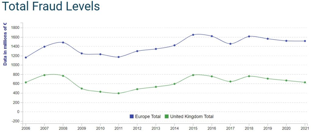 Interestingly, the top performers in the region in terms of overall fraud performance (the United Kingdom, Denmark and Sweden) have had the smallest increase in terms of overall card fraud threat, with Denmark the only country to see a reduction in threat levels (from 3.3 basis points in 2020 to 2.1 in 2021).