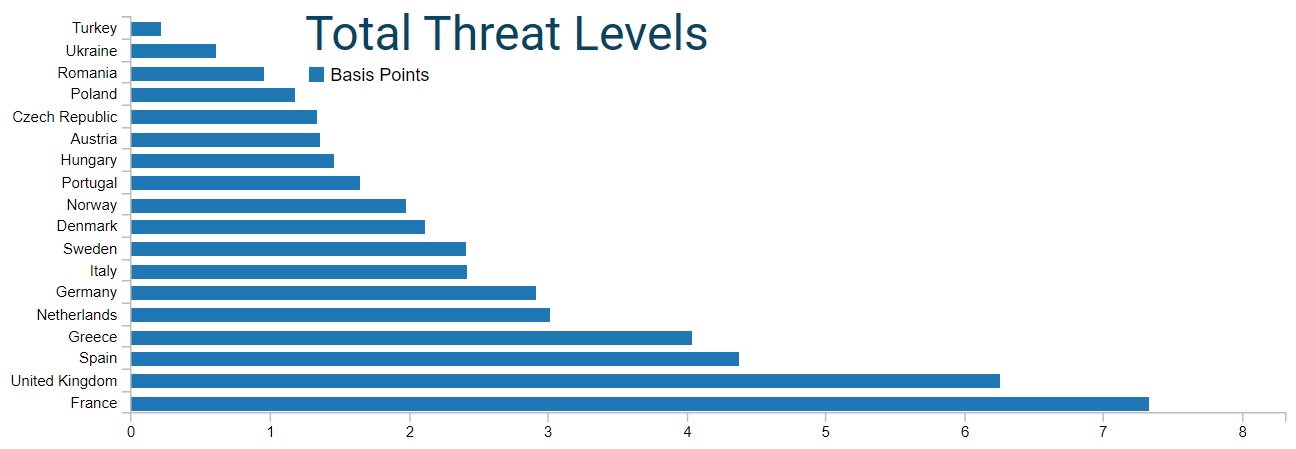 Whilst the United Kingdom and France had the highest basis points in both 2020 and 2021, the threat levels in other countries have increased at an alarming rate over the last year.