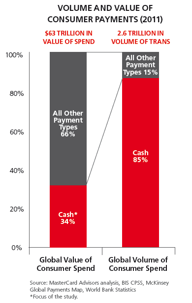 The study focuses on the value of all consumer payments ($63 trillion in total spend), including those that happen beyond retail point-of-sale. In 2011, 34% ($21 trillion) of total global consumer spend was done with cash, with cashless payments accounting for 66 percent ($42 trillion).