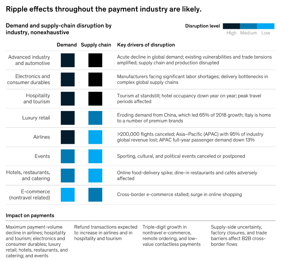 - Cross-border business-to-business transactions have also been affected. Container freight is down since January, considerably lower than its level in the comparable period of 2019.4 However, supply chains will be disrupted over the longer term because different geographies will emerge from the crisis at different times. Chinese manufacturers, for example, won’t be able to sell engine parts to US automakers until US car production resumes.
