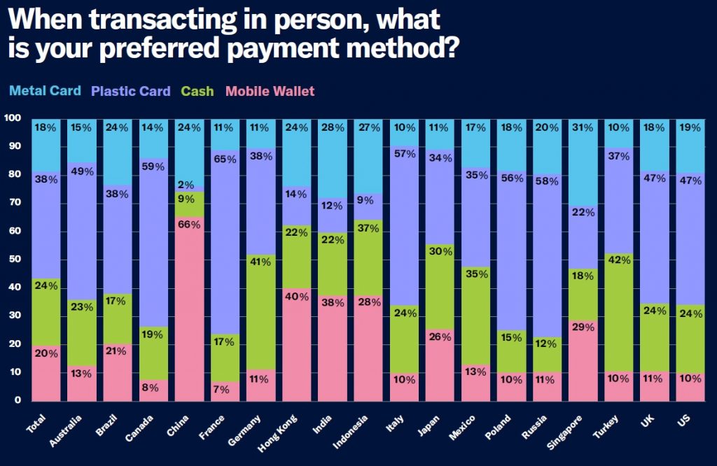 Awareness of metal cards also grew 7% from the prior survey. Globally, the majority (59%) of people were unaware of metal cards. The Asia Pacific (APAC) region was the most familiar with metal cards (India 24%, China 35%, Indonesia 41%, Singapore 51% and Japan 54%); however, many untapped regions have tremendous growth potential due to the lack of awareness of metal cards: Poland (74%), Canada (74%), Australia (70%), Germany (69%), Mexico (68%), Turkey (67%), U.K. (66%), Italy (65%), and Brazil (65%).