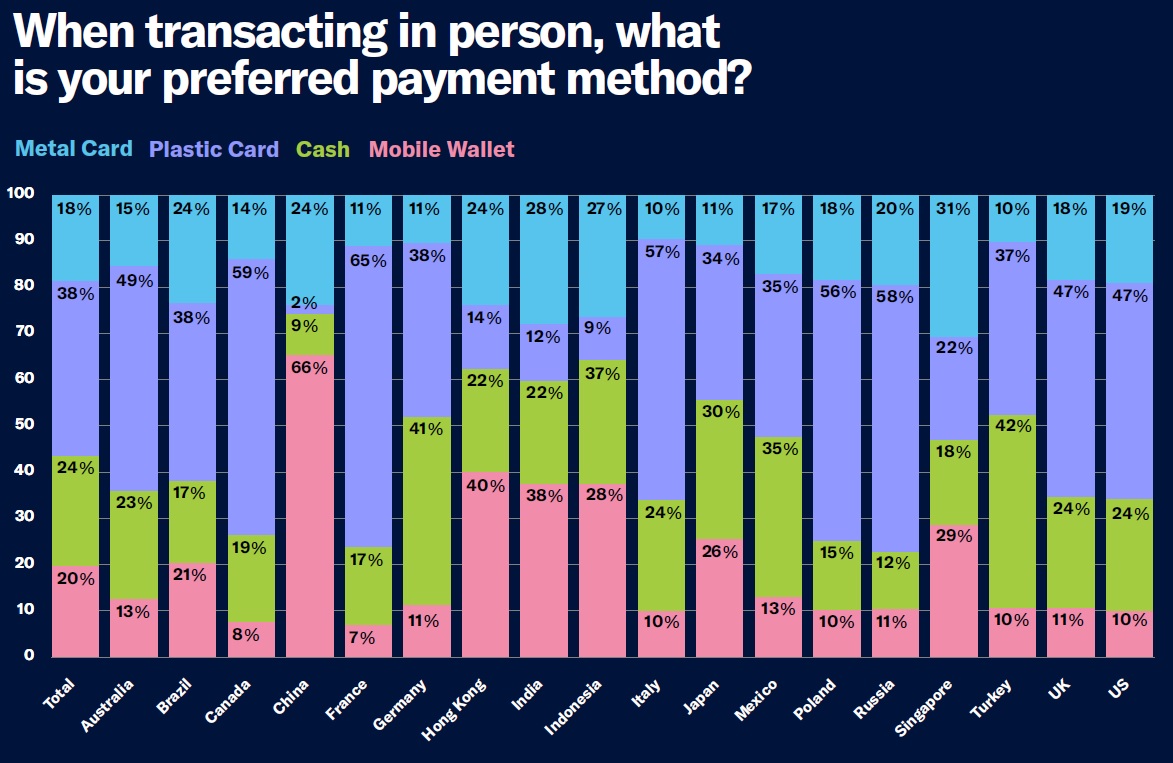 Consumers in many affluent and technology-forward countries preferred physical cards by an overwhelming majority versus digital wallets: US (only 10% preferred digital wallets), France (only 7% preferred digital wallets), Canada (only 18% preferred digital wallets), Poland (only 10% preferred digital wallets), Italy (only 10% preferred digital wallets), and UK (only 11% preferred digital wallets).