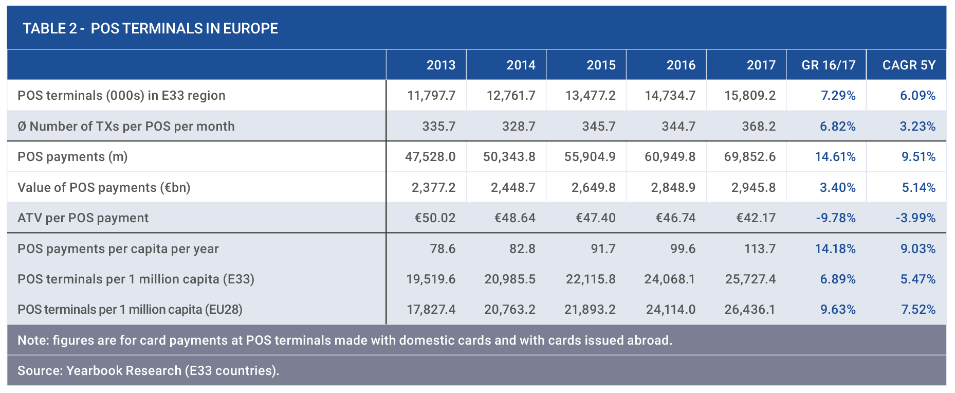 In 2017, the POS terminal base across the E33 countries grew by 7.3 percent to 15.8 million (CAGR: 6.1 percent). The roll-out of contactless POS terminals and mPOS terminals for small merchants has contributed to stronger growth since 2015.