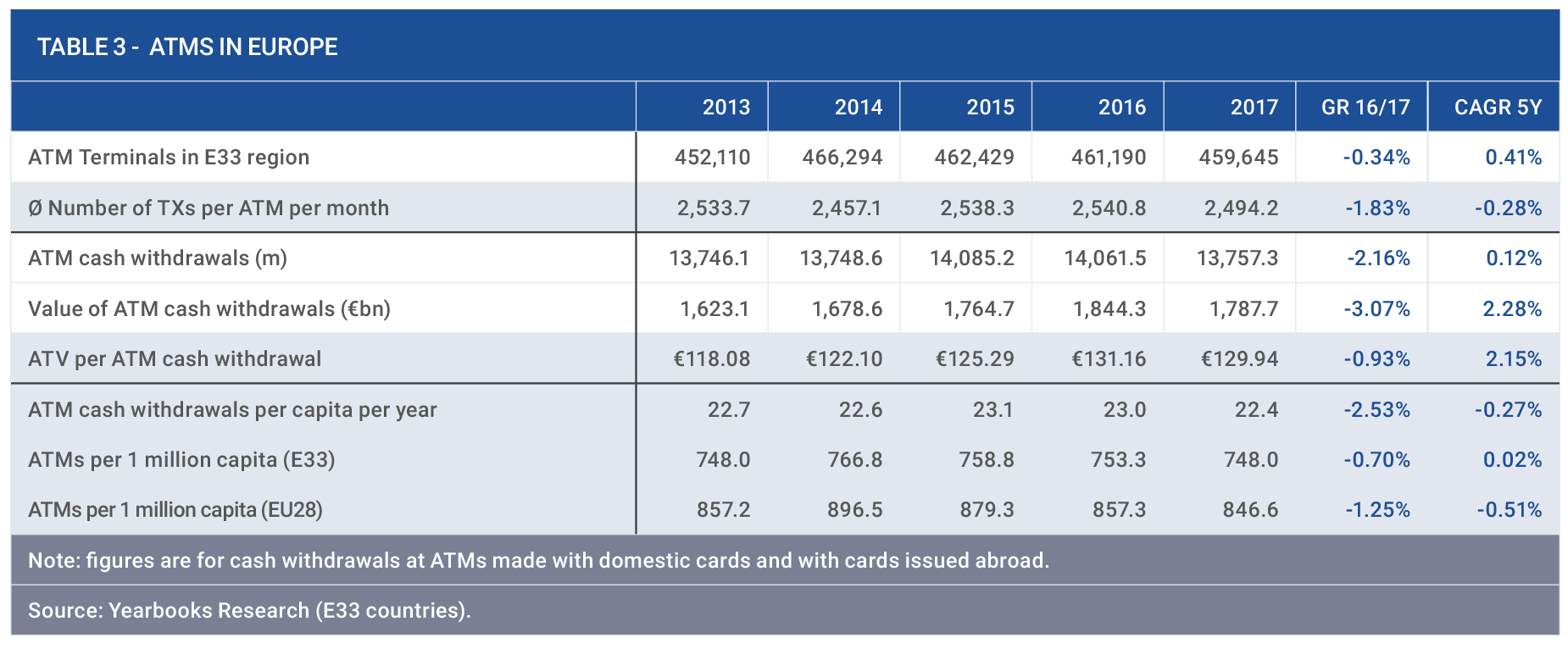 The number of ATMs continued to decline slightly, with 459,645 ATMs across the E33 countries covered in the Yearbook. This decline of -0.3 percent from 2016 compares with a low CAGR of +0.4 percent in ATM numbers over the last five years. The number of cash withdrawals per ATM each month amounted to an average of 2,494 withdrawals.