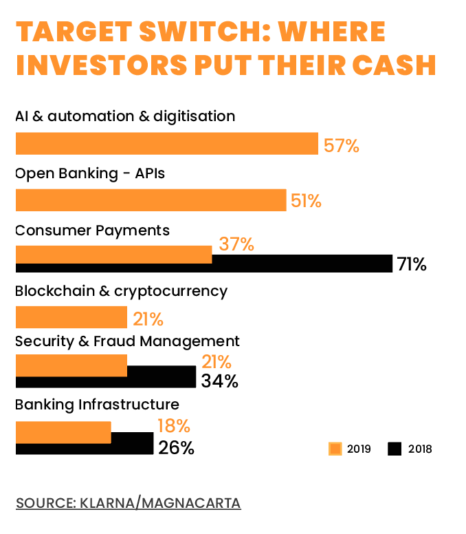 Data from the Klarna/MagnaCarta 2019 FinTech Disruptors Report confirms that the switch in investor interest from consumer solutions to business-to-business payments has been underway for a while now; between 2018 and 2019, the number of investments in new FinTechs focused on consumer payments dropped by around 30 percent, while new areas such as Artificial Intelligence and blockchain came from nowhere to account for between one-fifth and a half of all new payments FinTechs.