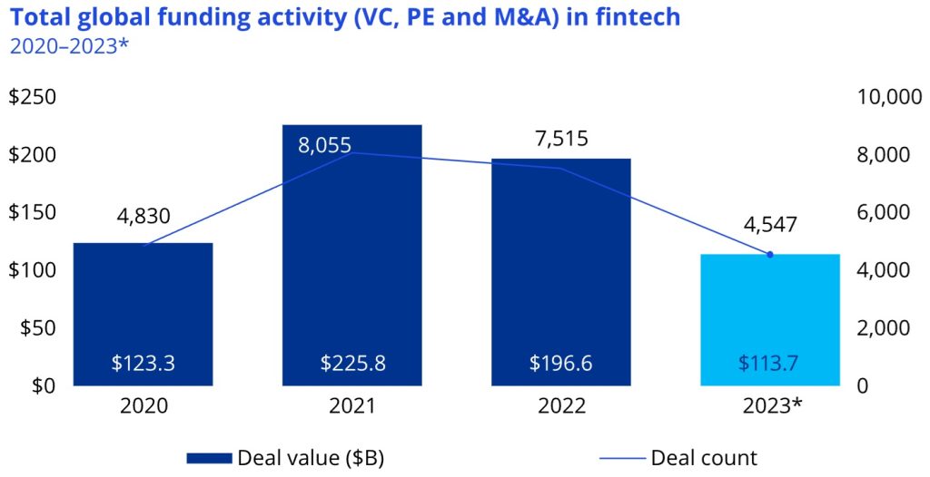 2023 was a difficult year for the fintech market globally, with both total fintech investment ($113.7 billion) and the number of fintech deals (4,547) experiencing their weakest results since 2017.
