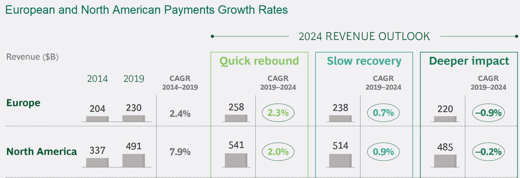 Projections show that payments revenue growth in North America will grow by a moderate CAGR of 2.0% from 2019 to 2024 under a quick-rebound scenario and would turn slightly negative if the region experiences a more protracted recovery.