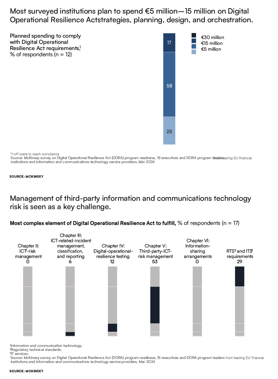 A McKinsey report in June 2024 highlighted some key budget allocations and technical challenges associated with DORA on the part of Financial Institutions and their providers.