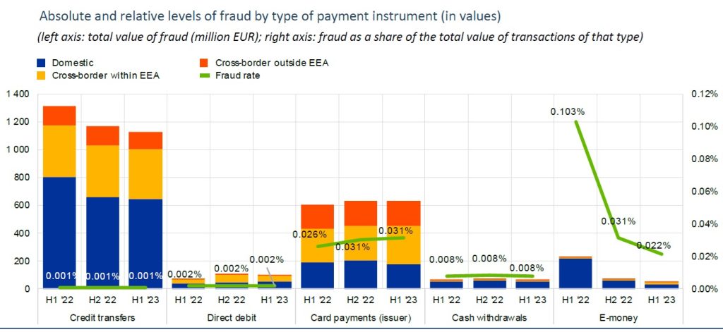 The report reveals that the total value of fraudulent transactions across the EEA amounted to €4.3 billion in 2022 and €2.0 billion in H1 2023. The most significant portion of fraud in 2023 stemmed from credit transfers and card payments, which jointly contributed to the majority of fraudulent activity.