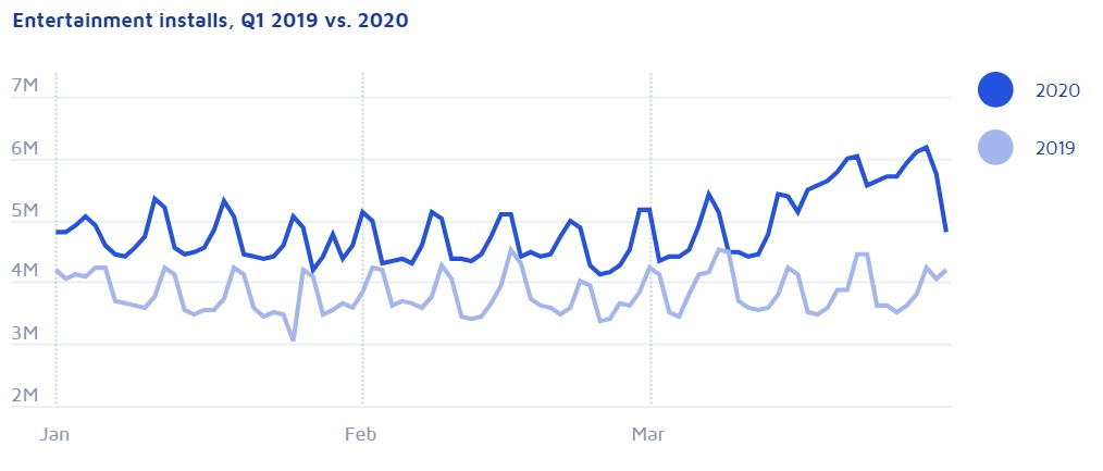 The stark uptick in installs for Entertainment apps tells the most clear story of where the App Economy is headed in the age of the coronavirus: toward the comforts of streaming. Installs have increased rapidly since people began staying home, trending 55% above where they were last year.