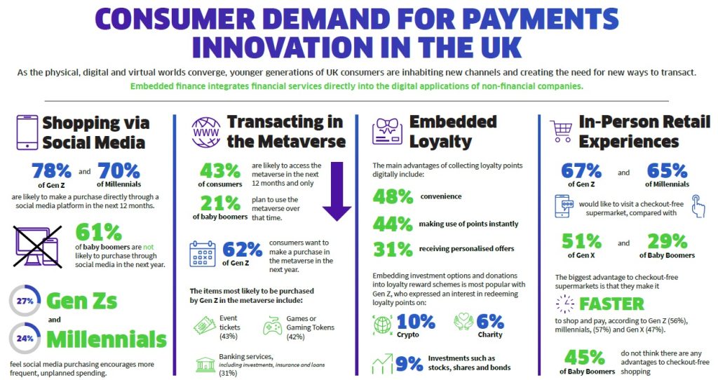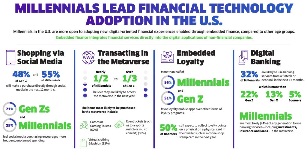 “Between the desire to tap into seamless shopping experiences like those in social media apps or taking advantage of the discounts and savings available through loyalty apps, the signal from Millennials and Gen Z is that there is significant potential for businesses to embed financial services within these channels.”