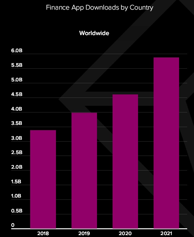 Finance app downloads in India surpassed 1 billion in 2021, fuelling the 28% YoY increase in finance app downloads worldwide to 5.9 billion.