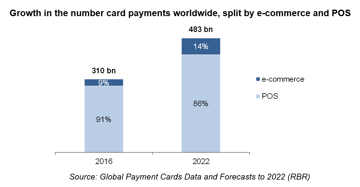 The number of card payments made online worldwide is set to jump from 29 billion in 2016 to 70 billion in 2022, according to Global Payment Cards Data and Forecasts... read more