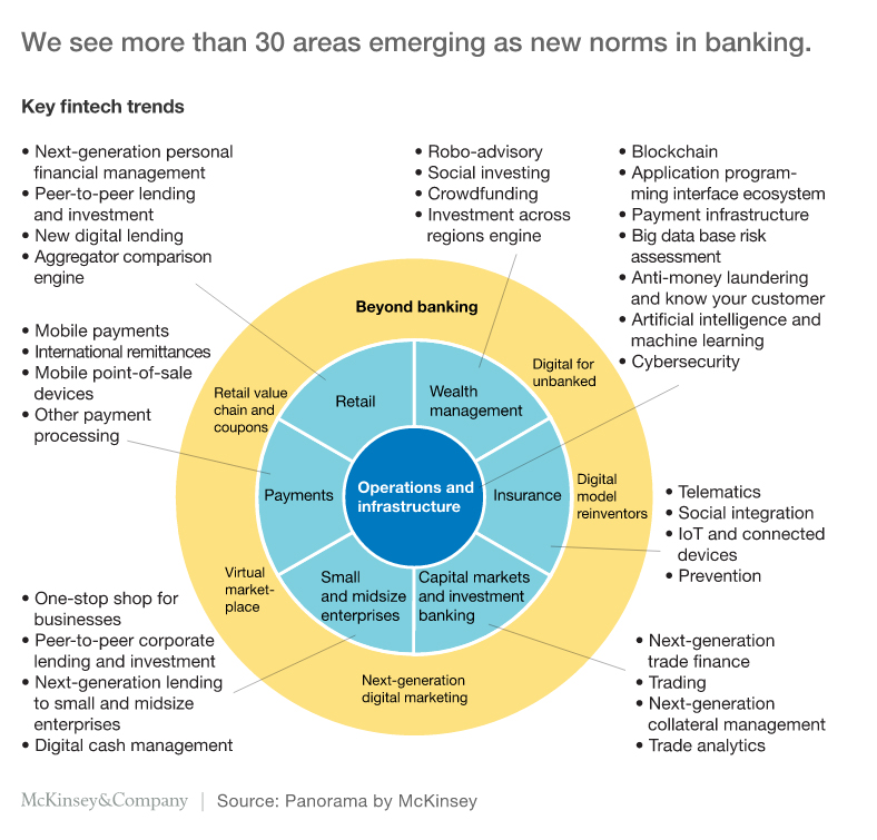 The shift brings FinTechs away from a focus on frontline activities to a broad engagement throughout the value chain. The new offerings cut across a wide swath of financial services: retail, wealth management, small- and midsize enterprises (SMEs), corporate and investment banking, and insurance.