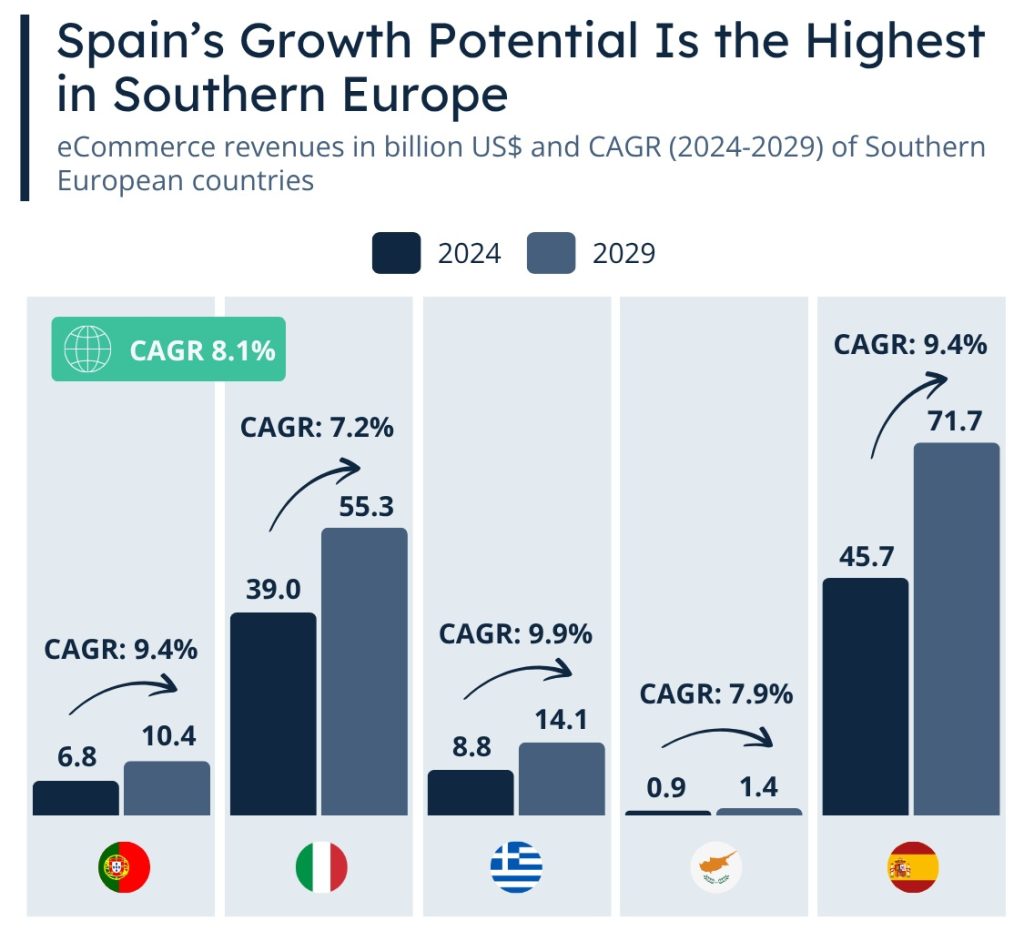 According to data from ECDB, these markets are poised to outperform the worldwide e-commerce compound annual growth rate (CAGR) of 8.1%, with Greece leading at 9.9%, followed closely by Spain and Portugal at 9.4%.