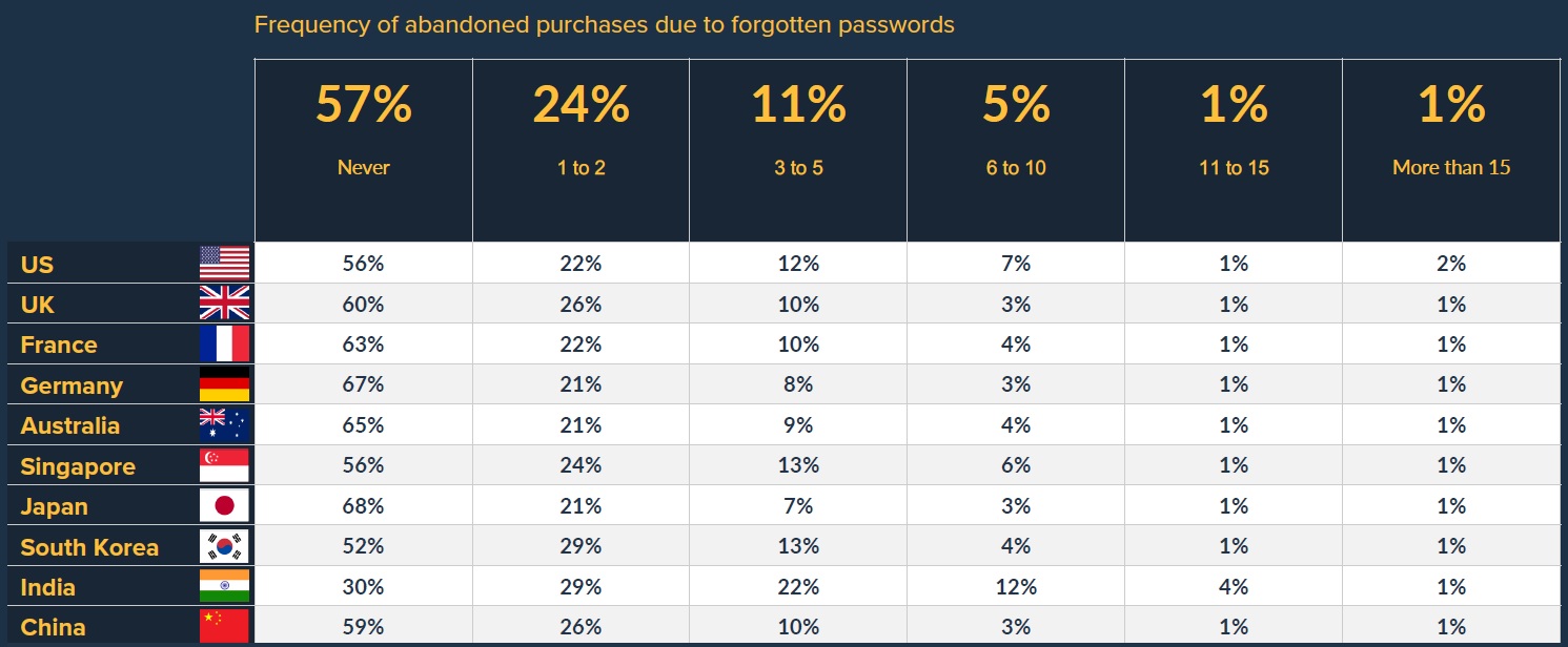 Service providers and retailers also were impacted, with 59% of people giving up on accessing online services in a given month and 43% abandoning purchases because they couldn’t remember their passwords.