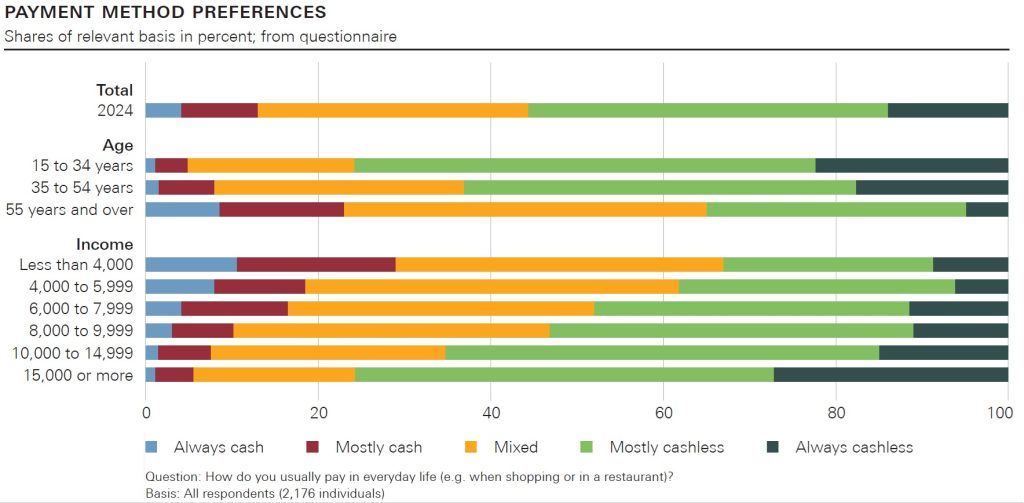 According to the Swiss National Bank’s (SNB) latest consumer payments survey, 35% of in-store transactions in 2023 were conducted via debit cards, compared with 30% using cash.